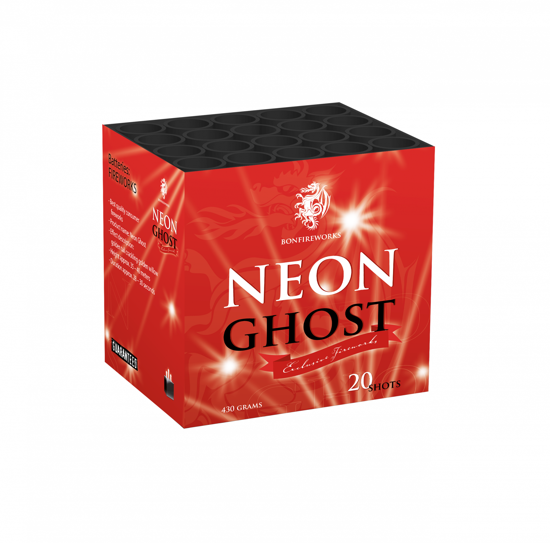 En nog een 20 schots cake uit de exclusieve Bonfireworks lijn van Rubro. Deze cake is voorzien van het bijzondere ghost-effect in combinatie met rood, blauw en geel.